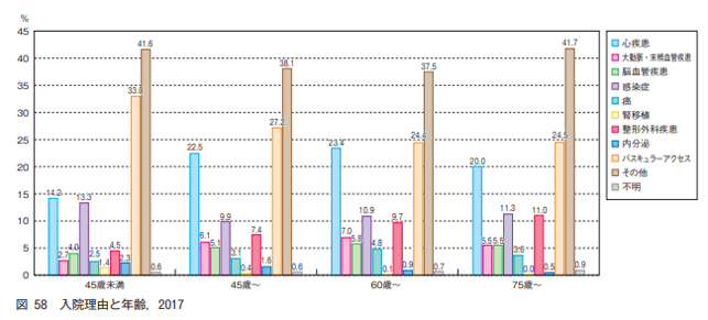 2017年の透析医学会の統計調査では、年齢別や治療方法別の入院理由を調査しています。