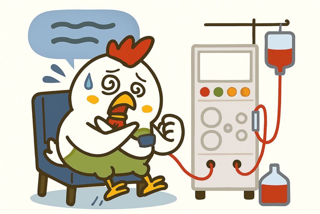 発症頻度は決して多くありませんが、重篤な症状につながることがあります。透析中に、胸や喉が痒くなるなど、違和感を感じたら早めに透析室のスタッフに声をかけてください。