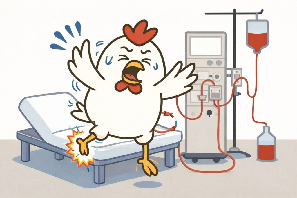 これは気持ちはわかるので、仕方ないとも思うのですが、透析中や透析後に、足をつって立ち上がってしまう患者さんが多くいらっしゃいます。