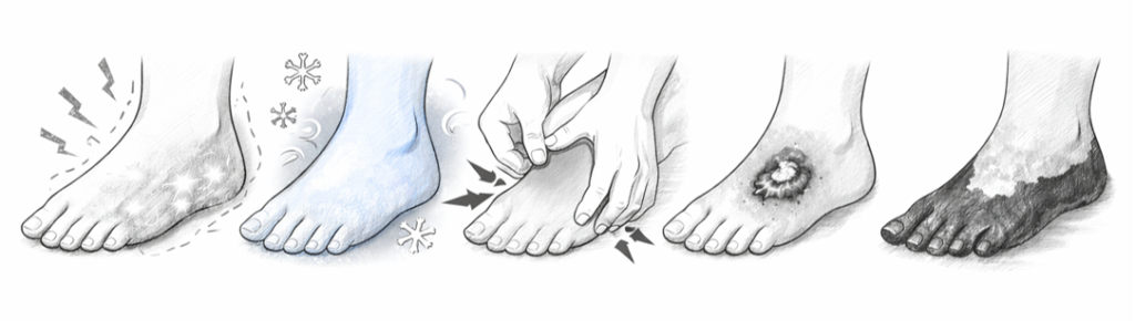 切断に至る直前の患者さんの足は、紫に変色し、冷たくなってしまいます。そして患者さんは、透析中に激しい痛みを訴えています。
